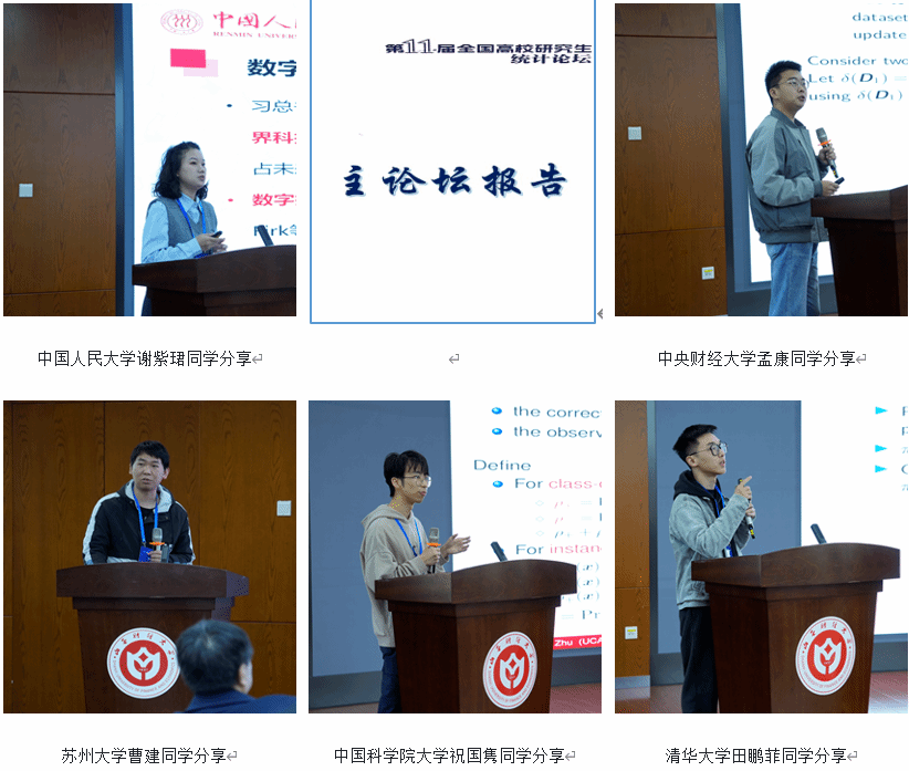 主论坛环节,来自中国人民大学谢紫珺、中央财经大学孟康、苏州大学曹建、中国科学院大学祝国隽及清华大学田鹏菲等五位“十佳论文”作者依次作学术报告。他们的研究成果紧扣实际问题、视角新颖,充分展现出统计专业研究生敏锐的学术问题意识与扎实的专业知识功底。