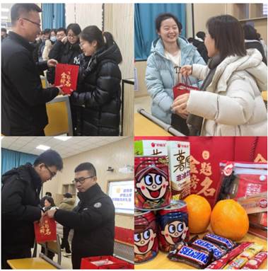 学院为学子送上专属祝福的暖心大礼包,外包装印刻 “金榜题名” 的殷切期许,礼包内的每一份物品都藏着巧思:两罐旺仔牛奶,愿备考学子们元气满满、逢题必解;一颗清甜橙子,祝大家称心如意、顺遂无忧;一盒香脆薯片,盼众人前路“薯”光相伴、势不可挡;士力架与咖啡搭配,为冲刺阶段补充能量、提神续航;全套定制文具加持,助同学们落笔生花、笔下生辉。这份满载心意的礼包,既是实用的应考助力,更是学院对考研学子最诚挚的祝福。