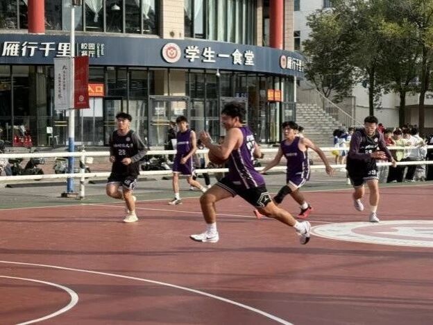 赛场被呐喊声包裹,男生们在篮球场上奔涌如潮。持球突破时的疾风、跃起封盖时的身影、篮板下的激烈争抢,每一个动作都裹挟着热血,展现出统计健儿的顽强风采。