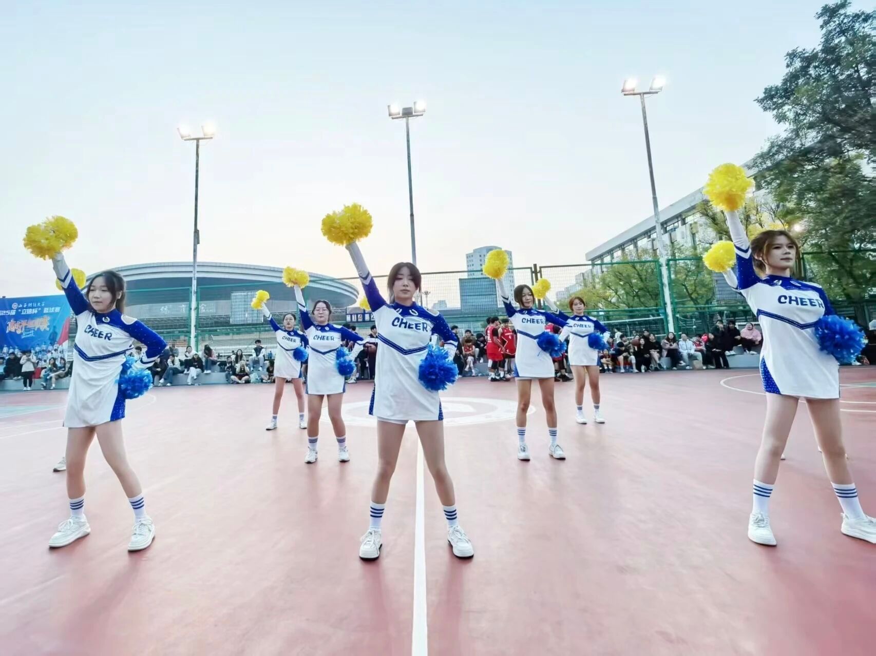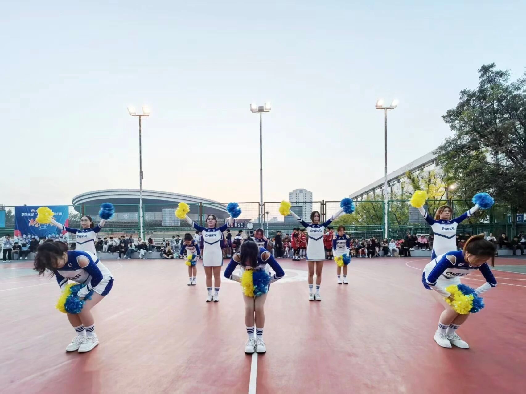 球赛哨声一歇,音乐即刻炸响。啦啦队员手持彩球奔入场中,亮彩战服格外耀眼。她们同步完成X跳与巴塞转体,队形速变为“金字塔”托举,花球翻飞间点燃全场热情。